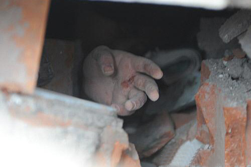 ——看到都江堰聚源鎮中學廣場擺放的遇難者遺體,總理心情沉重。